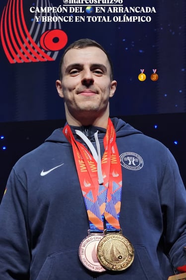Marcos Ruiz, se proclama campeón del mundo en arrancada, con un levantamiento de 183 kg, 212 kg en dos tiempos, clasificando en 4ª posición, y consigue un bronce con un total olímpico de 395 kg, un hazaña histórica para la halterofilia española, ya que nunca nadie había conseguido un oro mundial absoluto masculino y mucho menos una medalla en un total olímpico.